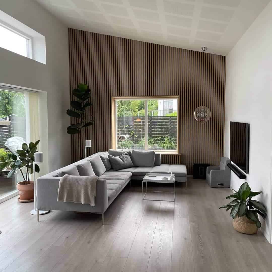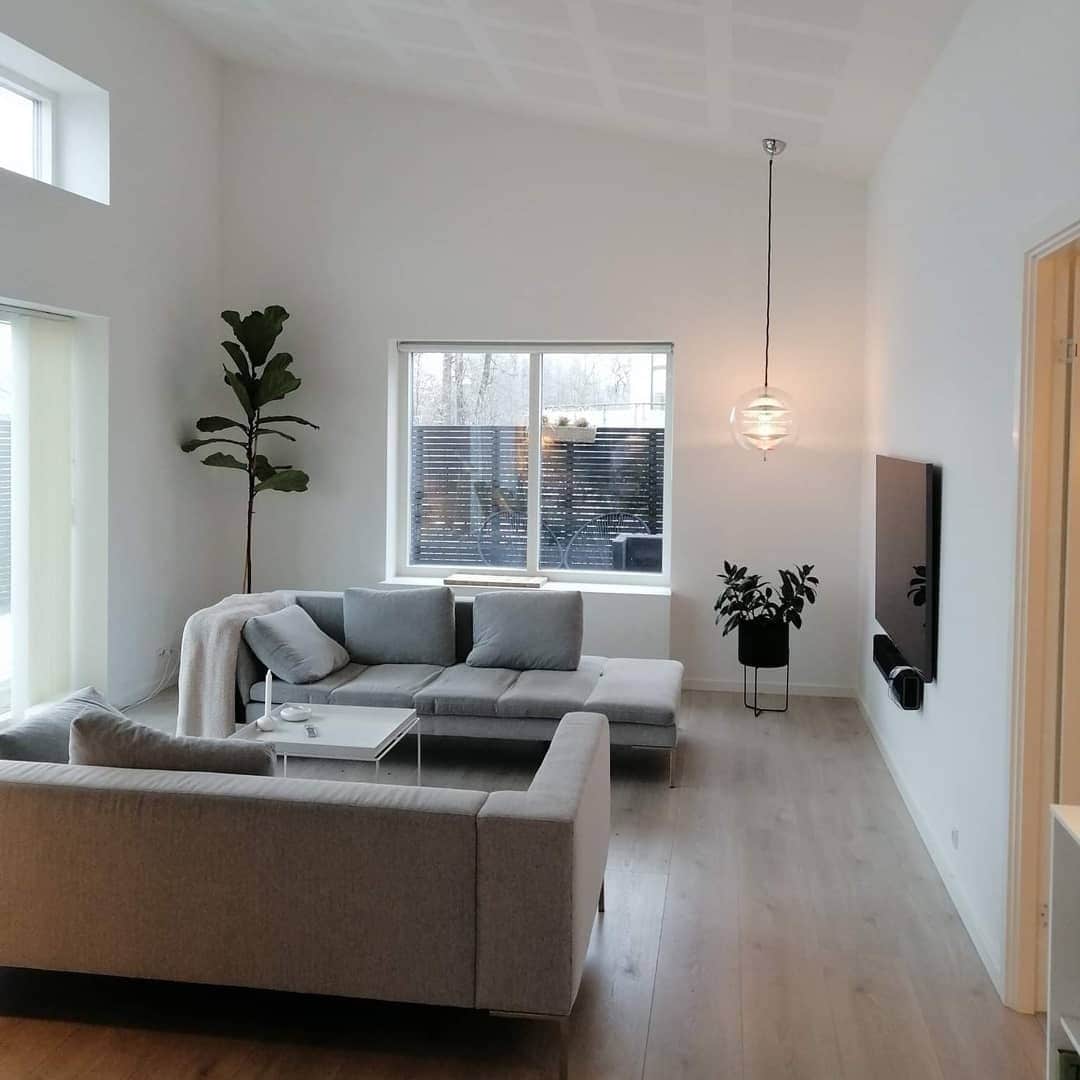 I Louise og Thomas’ stue har jeg beklædt endevæggen med akustikpaneler og lavet et siddevindue. Se før/efter billede.